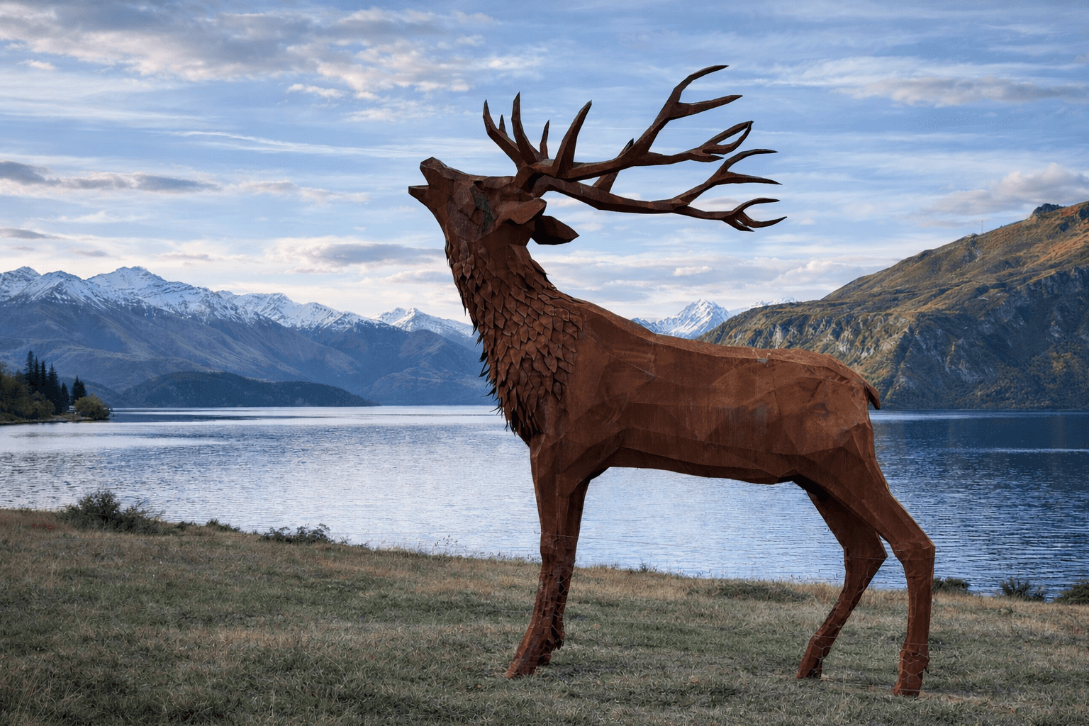 The roar is one of those things that belongs to this part of the world. If you've spent time in the hills around Wānaka in autumn, you know it. This piece was built to capture that, the presence of a stag in full voice, on his terms. 3.3 metres tall, built from corten steel in Glendhu, Wānaka. The detail goes right through, down to the hooves and legs, because that's where the life is. Scale matters with a piece like this and so does getting the small things right. It's currently on display outside Crossfire at Wānaka Airport, where you can see it up close. The Roaring Stag is available for sale. Custom commissions are always welcome. Price: 36.000 $